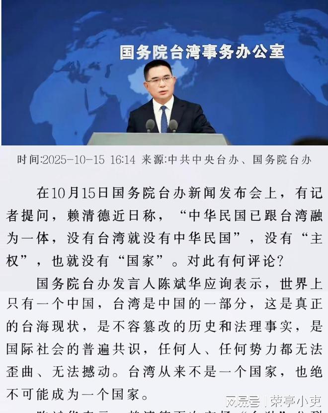 10月15日,国务院台办发言人陈斌华应询表示,世界上只有一个中国,台湾是中国的一部分,这是真正的台海现状,是不容篡改的历史和法理事实,是国际社会的普遍共识,任何人、任何势力都无法歪曲、无法撼动 。赖清德再次宣扬“”分裂谬论,是对“”主张的冷饭再炒,是对歪理邪说的拙劣拼接,更是对两岸同胞民族情感的肆意践踏,充分暴露其对历史和法理事实的无知,对广大台胞利益福祉的无视。